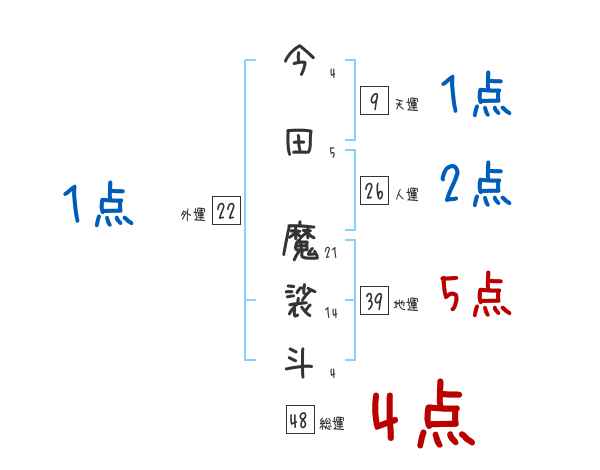 天運![]() | 今田魔裟斗さんの天運は9画の1つ星!消極的で才能を発揮することが苦手なことも。周りの意見に耳を傾けましょう。 家系が持つ宿命的な運勢を表します。祖先から受け継いだ苗字ですので自分の力が及びません。家柄を象徴します。 |