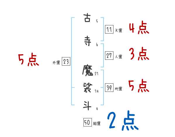 天運![]() | 古寺魔裟斗さんの天運は11画の4つ星!着実に富や地位を得る幸運な人生。 家系が持つ宿命的な運勢を表します。祖先から受け継いだ苗字ですので自分の力が及びません。家柄を象徴します。 |