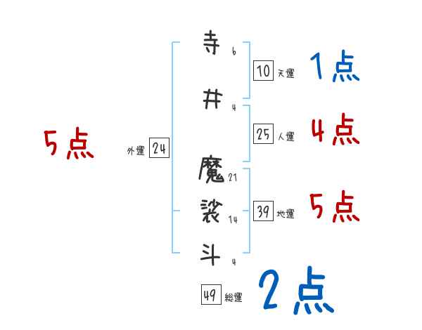 外運![]() | 寺井魔裟斗さんの外運は24画の5つ星!家庭運が良く順調な人生。金運にも恵まれる。 生活面を象徴する運勢です。外部から受ける影響力を表し、結婚運、家庭運や職場、環境への順応性を表します。 |