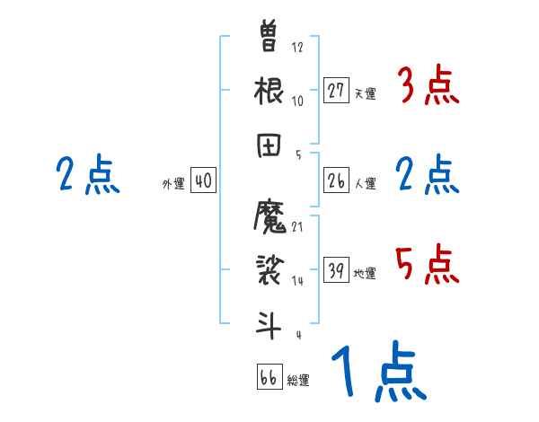 総運![]() | 曽根田魔裟斗さんの総運は66画の1つ星!迷うことが多く挫折しやすい傾向が。辛抱強く物事に取り組みましょう。 あなたの人生を表す1番重要な運勢です。生涯を通じて影響する総合運となり、主に50歳以降の晩年期に影響を及ぼします。 |