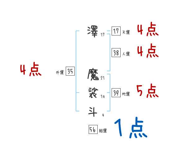 外運![]() | 澤魔裟斗さんの外運は35画の4つ星!温厚な性格で感受性が高い。穏和な性格で人望が厚い。 生活面を象徴する運勢です。外部から受ける影響力を表し、結婚運、家庭運や職場、環境への順応性を表します。 |