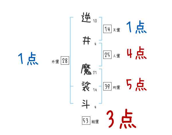 外運![]() | 逆井魔裟斗さんの外運は28画の1つ星!家庭環境に注意。スポーツで活躍できる能力があるかも。 生活面を象徴する運勢です。外部から受ける影響力を表し、結婚運、家庭運や職場、環境への順応性を表します。 |