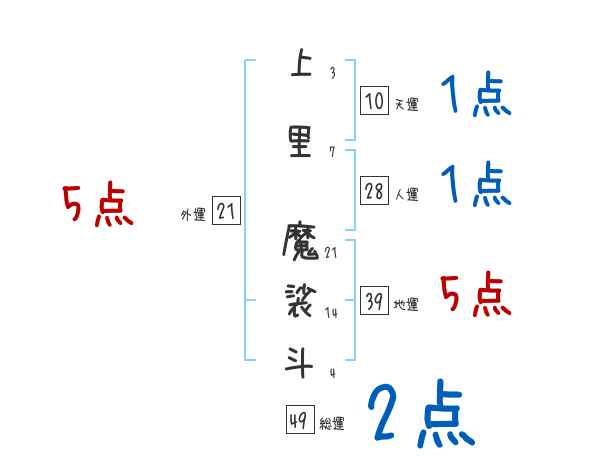 外運![]()  | 上里魔裟斗さんの外運は21画の5つ星!統率力がある。独立し成功する。名誉を手に入れる。 生活面を象徴する運勢です。外部から受ける影響力を表し、結婚運、家庭運や職場、環境への順応性を表します。 |