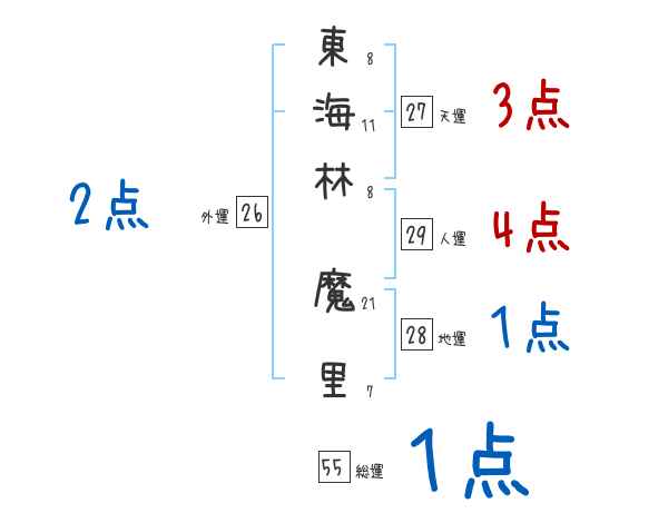 天運![]() | 東海林魔里さんの天運は27画の3つ星!頭脳明晰だが強情で摩擦が多い傾向。孤立に注意。 家系が持つ宿命的な運勢を表します。祖先から受け継いだ苗字ですので自分の力が及びません。家柄を象徴します。 |