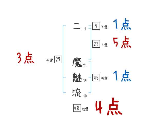 人運![]() | 二魔魅流さんの人運は23画の5つ星!想像力に優れ活力がある。一代で成功し名誉を手に入れる。 性格や才能などを表す2番目に重要な運勢です。人間関係や協調性、社会的な成功に影響します。主に20歳から50歳ぐらいまでの中年期の運勢を表します。 |