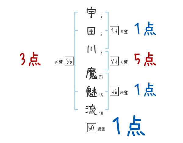 外運![]() | 宇田川魔魅流さんの外運は36画の3つ星!先見性が豊かです。多少神経質で苦労することも。 生活面を象徴する運勢です。外部から受ける影響力を表し、結婚運、家庭運や職場、環境への順応性を表します。 |