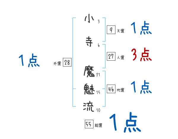 天運![]() | 小寺魔魅流さんの天運は9画の1つ星!消極的で才能を発揮することが苦手なことも。周りの意見に耳を傾けましょう。 家系が持つ宿命的な運勢を表します。祖先から受け継いだ苗字ですので自分の力が及びません。家柄を象徴します。 |