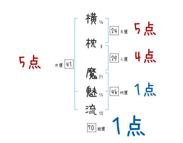 天運![]() | 横枕魔魅流さんの天運は24画の5つ星!家庭運が良く順調な人生。金運にも恵まれる。 家系が持つ宿命的な運勢を表します。祖先から受け継いだ苗字ですので自分の力が及びません。家柄を象徴します。 |