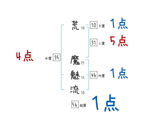 外運![]() | 荒魔魅流さんの外運は35画の4つ星!温厚な性格で感受性が高い。穏和な性格で人望が厚い。 生活面を象徴する運勢です。外部から受ける影響力を表し、結婚運、家庭運や職場、環境への順応性を表します。 |