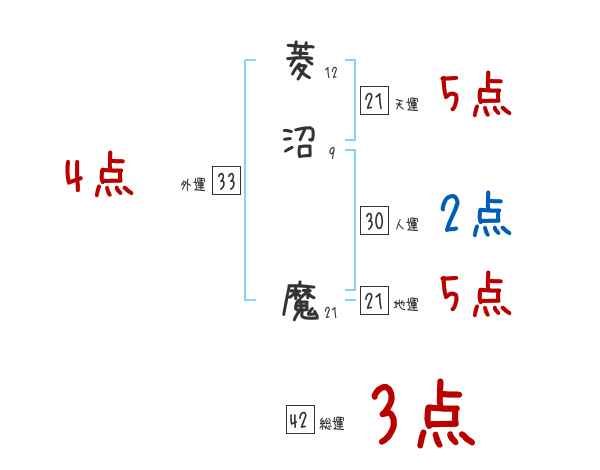 天運![]() | 菱沼魔さんの天運は21画の5つ星!統率力がある。独立し成功する。名誉を手に入れる。 家系が持つ宿命的な運勢を表します。祖先から受け継いだ苗字ですので自分の力が及びません。家柄を象徴します。 |