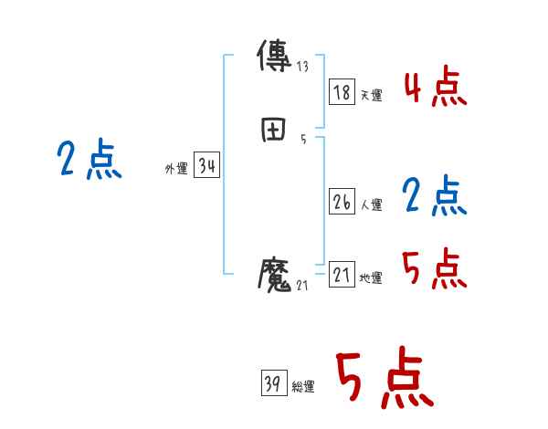 天運![]() | 傳田魔さんの天運は18画の4つ星!情熱的で剛気。忍耐力があり信頼される。 家系が持つ宿命的な運勢を表します。祖先から受け継いだ苗字ですので自分の力が及びません。家柄を象徴します。 |