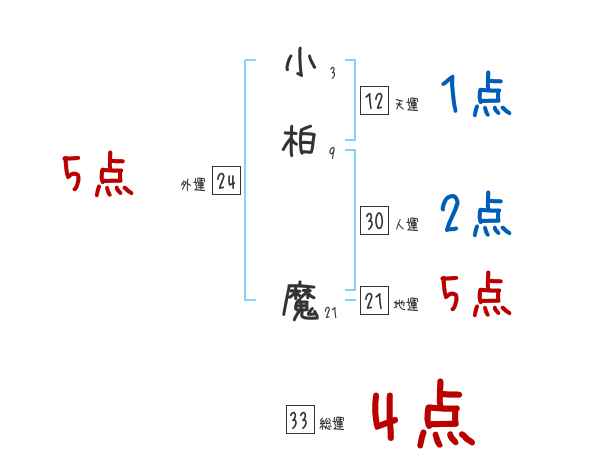 外運![]() | 小柏魔さんの外運は24画の5つ星!家庭運が良く順調な人生。金運にも恵まれる。 生活面を象徴する運勢です。外部から受ける影響力を表し、結婚運、家庭運や職場、環境への順応性を表します。 |