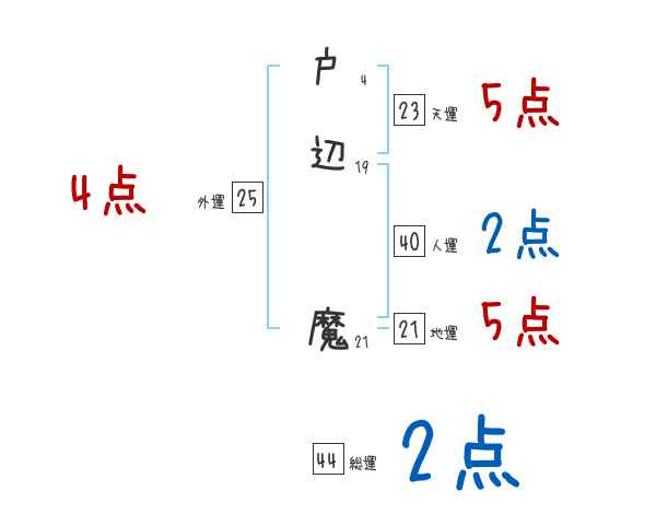 天運![]() | 戸辺魔さんの天運は23画の5つ星!想像力に優れ活力がある。一代で成功し名誉を手に入れる。 家系が持つ宿命的な運勢を表します。祖先から受け継いだ苗字ですので自分の力が及びません。家柄を象徴します。 |