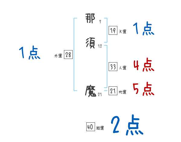 天運![]() | 那須魔さんの天運は19画の1つ星!優れた才能を持ちますが、協調性が足りないことも。周りの人と協力する事を意識しましょう。 家系が持つ宿命的な運勢を表します。祖先から受け継いだ苗字ですので自分の力が及びません。家柄を象徴します。 |
