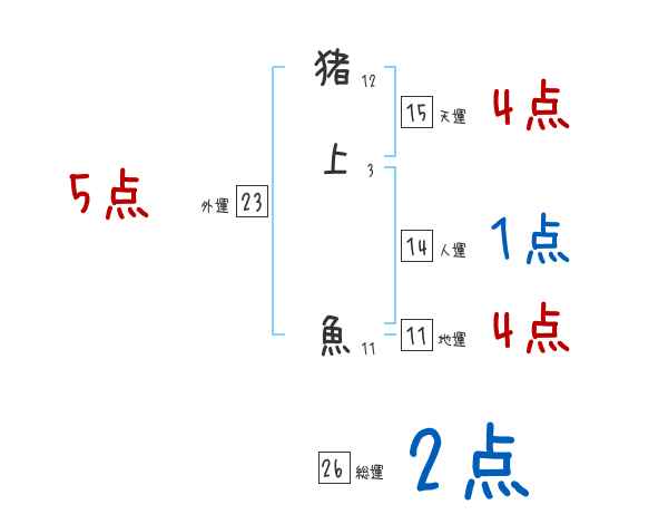 総運![]() | 猪上魚さんの総運は26画の2つ星!波瀾万丈かも。信頼できる人を大事にしましょう。 あなたの人生を表す1番重要な運勢です。生涯を通じて影響する総合運となり、主に50歳以降の晩年期に影響を及ぼします。 |