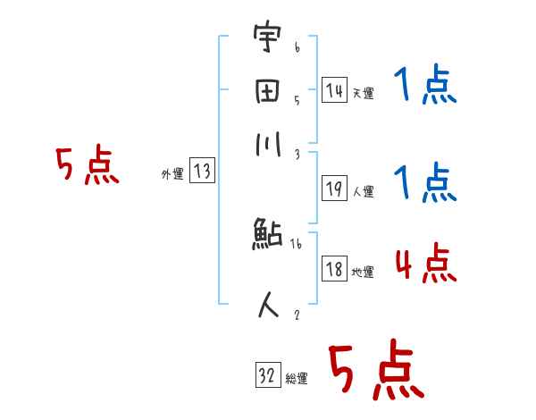 総運![]() | 宇田川鮎人さんの総運は32画の5つ星!柔軟性があり成功する。チャンスが多く金運が良い。 あなたの人生を表す1番重要な運勢です。生涯を通じて影響する総合運となり、主に50歳以降の晩年期に影響を及ぼします。 |