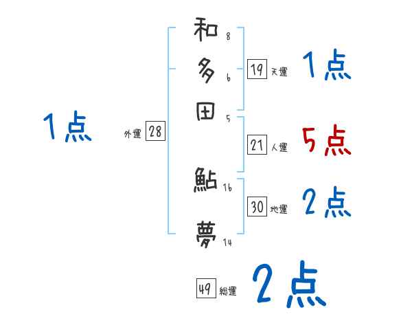 天運![]() | 和多田鮎夢さんの天運は19画の1つ星!優れた才能を持ちますが、協調性が足りないことも。周りの人と協力する事を意識しましょう。 家系が持つ宿命的な運勢を表します。祖先から受け継いだ苗字ですので自分の力が及びません。家柄を象徴します。 |
