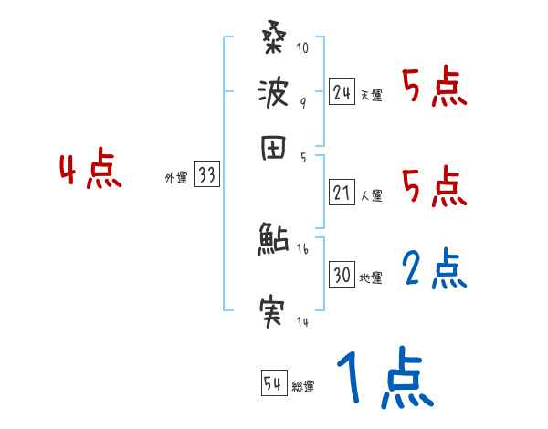 外運![]() | 桑波田鮎実さんの外運は33画の4つ星!権力志向でプライドが高い。勇気があり運を切り開き成功する。 生活面を象徴する運勢です。外部から受ける影響力を表し、結婚運、家庭運や職場、環境への順応性を表します。 |