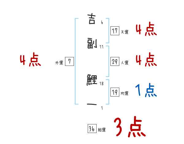 総運![]() | 吉副鯉一さんの総運は36画の3つ星!先見性が豊かです。多少神経質で苦労することも。 あなたの人生を表す1番重要な運勢です。生涯を通じて影響する総合運となり、主に50歳以降の晩年期に影響を及ぼします。 |