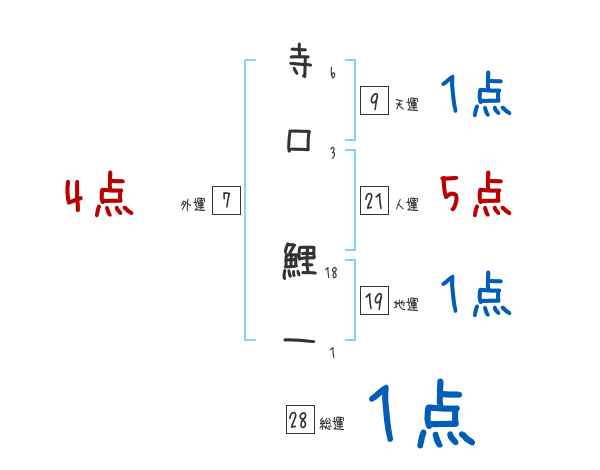 天運![]() | 寺口鯉一さんの天運は9画の1つ星!消極的で才能を発揮することが苦手なことも。周りの意見に耳を傾けましょう。 家系が持つ宿命的な運勢を表します。祖先から受け継いだ苗字ですので自分の力が及びません。家柄を象徴します。 |
