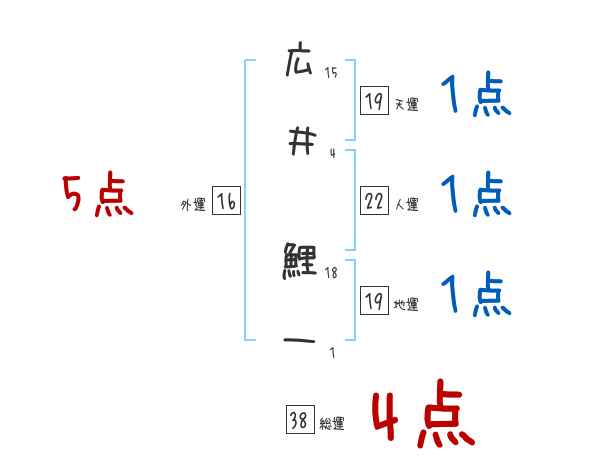 外運![]() | 広井鯉一さんの外運は16画の5つ星!人望が厚く大きく発展する。逆転成功が見える。 生活面を象徴する運勢です。外部から受ける影響力を表し、結婚運、家庭運や職場、環境への順応性を表します。 |
