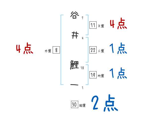 総運![]() | 谷井鯉一さんの総運は30画の2つ星!浮き沈みの激しさに注意しましょう。 あなたの人生を表す1番重要な運勢です。生涯を通じて影響する総合運となり、主に50歳以降の晩年期に影響を及ぼします。 |