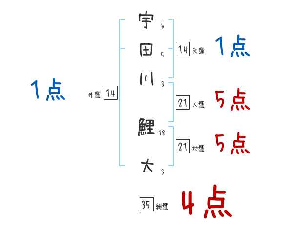 人運![]() | 宇田川鯉大さんの人運は21画の5つ星!統率力がある。独立し成功する。名誉を手に入れる。 性格や才能などを表す2番目に重要な運勢です。人間関係や協調性、社会的な成功に影響します。主に20歳から50歳ぐらいまでの中年期の運勢を表します。 |