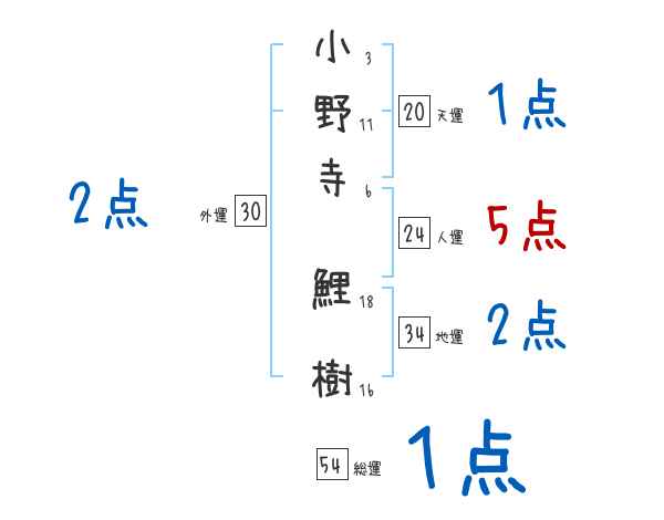 人運![]() | 小野寺鯉樹さんの人運は24画の5つ星!家庭運が良く順調な人生。金運にも恵まれる。 性格や才能などを表す2番目に重要な運勢です。人間関係や協調性、社会的な成功に影響します。主に20歳から50歳ぐらいまでの中年期の運勢を表します。 |