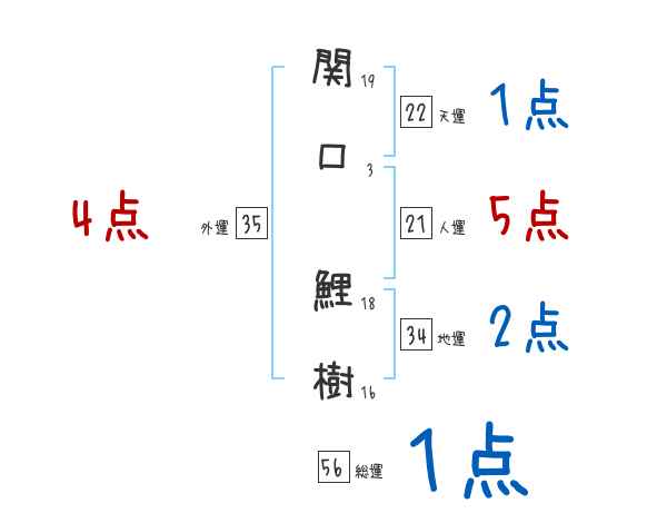 外運![]() | 関口鯉樹さんの外運は35画の4つ星!温厚な性格で感受性が高い。穏和な性格で人望が厚い。 生活面を象徴する運勢です。外部から受ける影響力を表し、結婚運、家庭運や職場、環境への順応性を表します。 |