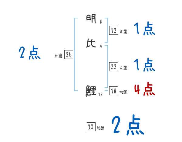 総運![]() | 明比鯉さんの総運は30画の2つ星!浮き沈みの激しさに注意しましょう。 あなたの人生を表す1番重要な運勢です。生涯を通じて影響する総合運となり、主に50歳以降の晩年期に影響を及ぼします。 |