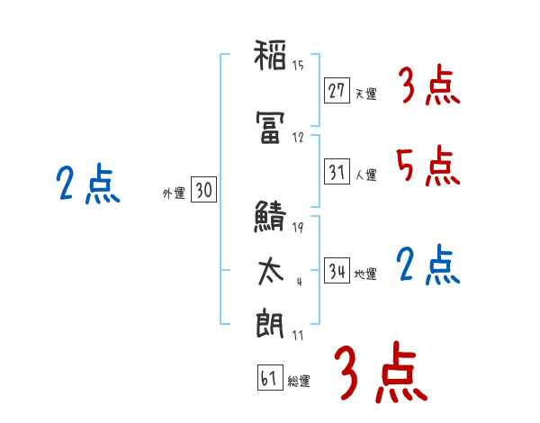 天運![]() | 稲冨鯖太朗さんの天運は27画の3つ星!頭脳明晰だが強情で摩擦が多い傾向。孤立に注意。 家系が持つ宿命的な運勢を表します。祖先から受け継いだ苗字ですので自分の力が及びません。家柄を象徴します。 |