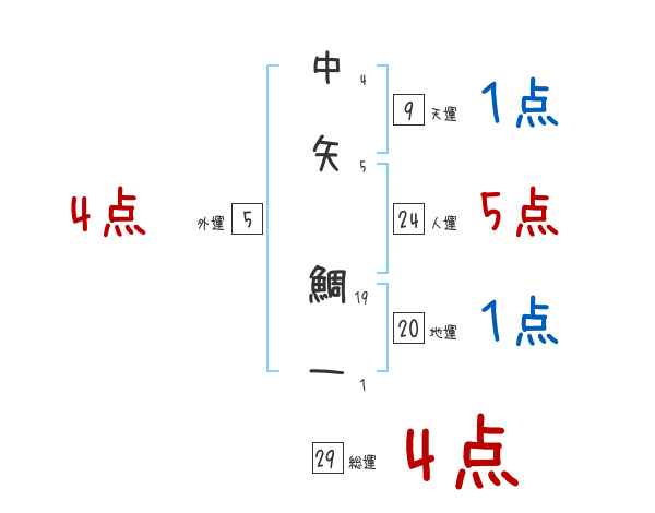 外運![]() | 中矢鯛一さんの外運は5画の4つ星!健康で安泰。協調性に優れ、財産に恵まれる。 生活面を象徴する運勢です。外部から受ける影響力を表し、結婚運、家庭運や職場、環境への順応性を表します。 |