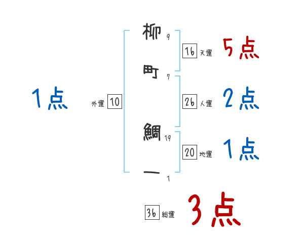 天運![]() | 柳町鯛一さんの天運は16画の5つ星!人望が厚く大きく発展する。逆転成功が見える。 家系が持つ宿命的な運勢を表します。祖先から受け継いだ苗字ですので自分の力が及びません。家柄を象徴します。 |