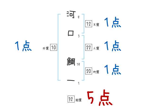 総運![]() | 河口鯛一さんの総運は32画の5つ星!柔軟性があり成功する。チャンスが多く金運が良い。 あなたの人生を表す1番重要な運勢です。生涯を通じて影響する総合運となり、主に50歳以降の晩年期に影響を及ぼします。 |
