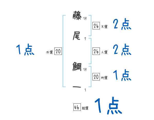 人運![]() | 藤尾鯛一さんの人運は26画の2つ星!波瀾万丈かも。信頼できる人を大事にしましょう。 性格や才能などを表す2番目に重要な運勢です。人間関係や協調性、社会的な成功に影響します。主に20歳から50歳ぐらいまでの中年期の運勢を表します。 |