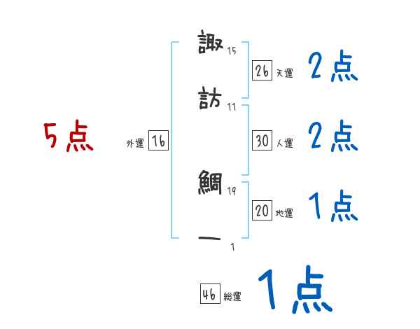 外運![]() | 諏訪鯛一さんの外運は16画の5つ星!人望が厚く大きく発展する。逆転成功が見える。 生活面を象徴する運勢です。外部から受ける影響力を表し、結婚運、家庭運や職場、環境への順応性を表します。 |