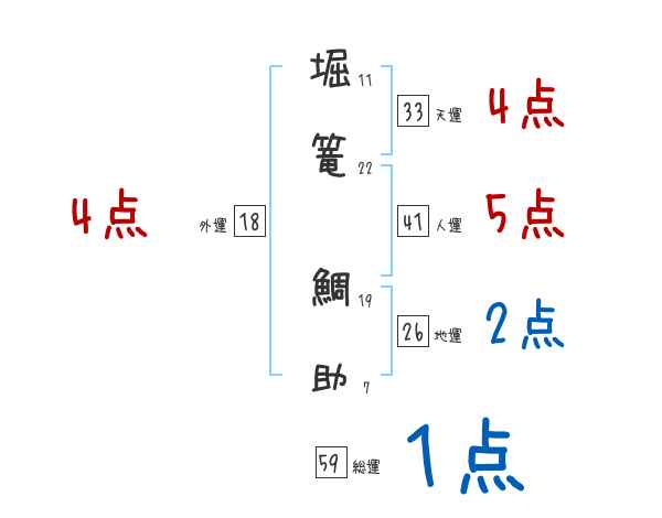 人運![]() | 堀篭鯛助さんの人運は41画の5つ星!大志を抱き、目標に向かって実力を発揮し達成する。温和な性格。 性格や才能などを表す2番目に重要な運勢です。人間関係や協調性、社会的な成功に影響します。主に20歳から50歳ぐらいまでの中年期の運勢を表します。 |