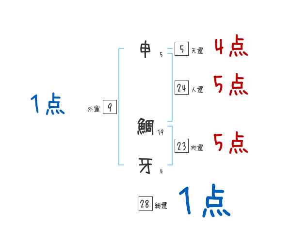 天運![]() | 申鯛牙さんの天運は5画の4つ星!健康で安泰。協調性に優れ、財産に恵まれる。 家系が持つ宿命的な運勢を表します。祖先から受け継いだ苗字ですので自分の力が及びません。家柄を象徴します。 |