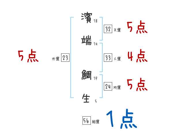 天運![]() | 濱端鯛生さんの天運は32画の5つ星!柔軟性があり成功する。チャンスが多く金運が良い。 家系が持つ宿命的な運勢を表します。祖先から受け継いだ苗字ですので自分の力が及びません。家柄を象徴します。 |
