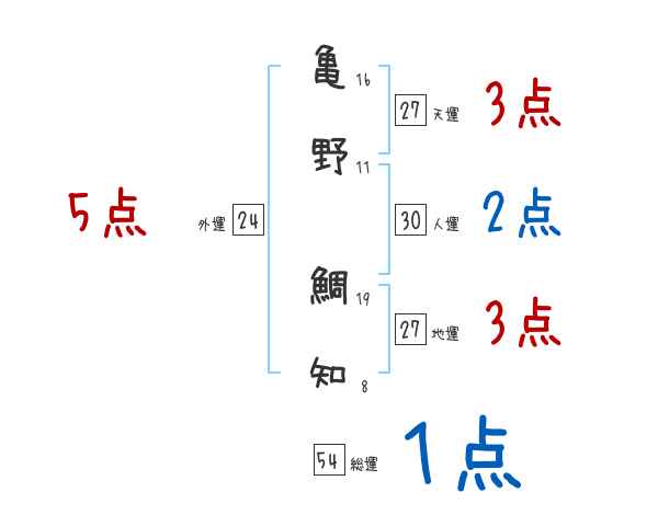 外運![]() | 亀野鯛知さんの外運は24画の5つ星!家庭運が良く順調な人生。金運にも恵まれる。 生活面を象徴する運勢です。外部から受ける影響力を表し、結婚運、家庭運や職場、環境への順応性を表します。 |