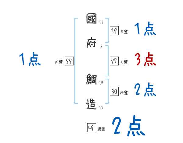 天運![]() | 國府鯛造さんの天運は19画の1つ星!優れた才能を持ちますが、協調性が足りないことも。周りの人と協力する事を意識しましょう。 家系が持つ宿命的な運勢を表します。祖先から受け継いだ苗字ですので自分の力が及びません。家柄を象徴します。 |