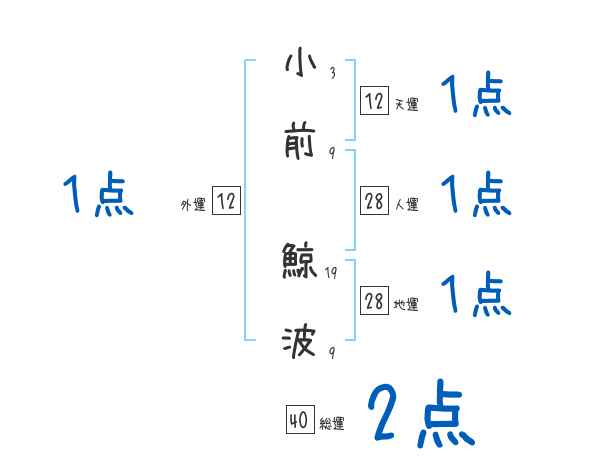 人運![]() | 小前鯨波さんの人運は28画の1つ星!家庭環境に注意。スポーツで活躍できる能力があるかも。 性格や才能などを表す2番目に重要な運勢です。人間関係や協調性、社会的な成功に影響します。主に20歳から50歳ぐらいまでの中年期の運勢を表します。 |