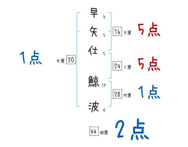 天運![]() | 早矢仕鯨波さんの天運は16画の5つ星!人望が厚く大きく発展する。逆転成功が見える。 家系が持つ宿命的な運勢を表します。祖先から受け継いだ苗字ですので自分の力が及びません。家柄を象徴します。 |