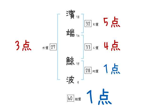 天運![]() | 濱端鯨波さんの天運は32画の5つ星!柔軟性があり成功する。チャンスが多く金運が良い。 家系が持つ宿命的な運勢を表します。祖先から受け継いだ苗字ですので自分の力が及びません。家柄を象徴します。 |