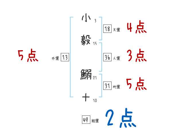 外運![]() | 小毅鰯十さんの外運は13画の5つ星!才能に恵まれ人気がある。名声を手に入れる。円満な人生。 生活面を象徴する運勢です。外部から受ける影響力を表し、結婚運、家庭運や職場、環境への順応性を表します。 |
