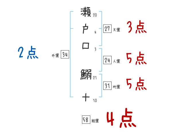 総運![]() | 瀬戸口鰯十さんの総運は58画の4つ星!安定した生活。大器晩成タイプ。 あなたの人生を表す1番重要な運勢です。生涯を通じて影響する総合運となり、主に50歳以降の晩年期に影響を及ぼします。 |