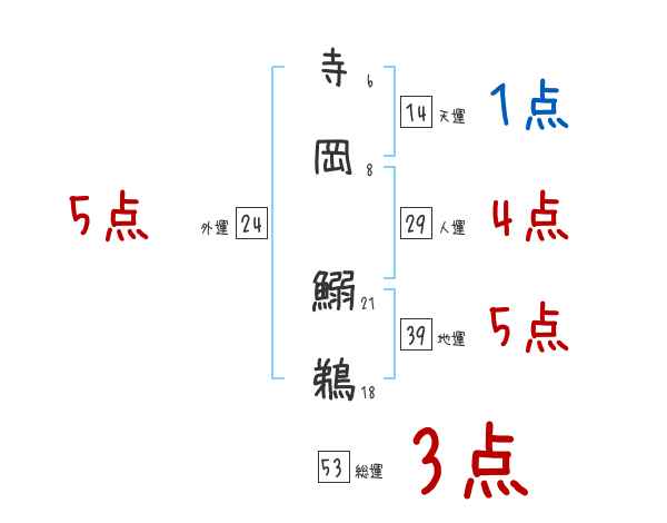 外運![]() | 寺岡鰯鵜さんの外運は24画の5つ星!家庭運が良く順調な人生。金運にも恵まれる。 生活面を象徴する運勢です。外部から受ける影響力を表し、結婚運、家庭運や職場、環境への順応性を表します。 |