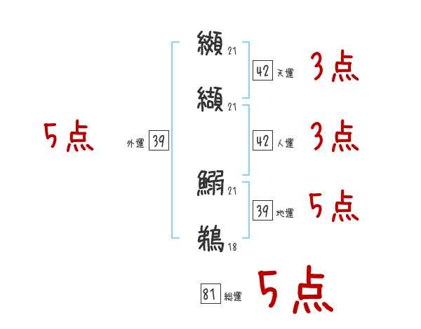 外運![]() | 纐纈鰯鵜さんの外運は39画の5つ星!社交性に優れ人望が厚い。人の上に立ち成功する。 生活面を象徴する運勢です。外部から受ける影響力を表し、結婚運、家庭運や職場、環境への順応性を表します。 |