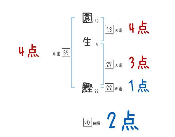 外運![]() | 園生鰹さんの外運は35画の4つ星!温厚な性格で感受性が高い。穏和な性格で人望が厚い。 生活面を象徴する運勢です。外部から受ける影響力を表し、結婚運、家庭運や職場、環境への順応性を表します。 |
