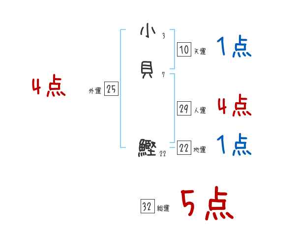 総運![]() | 小貝鰹さんの総運は32画の5つ星!柔軟性があり成功する。チャンスが多く金運が良い。 あなたの人生を表す1番重要な運勢です。生涯を通じて影響する総合運となり、主に50歳以降の晩年期に影響を及ぼします。 |